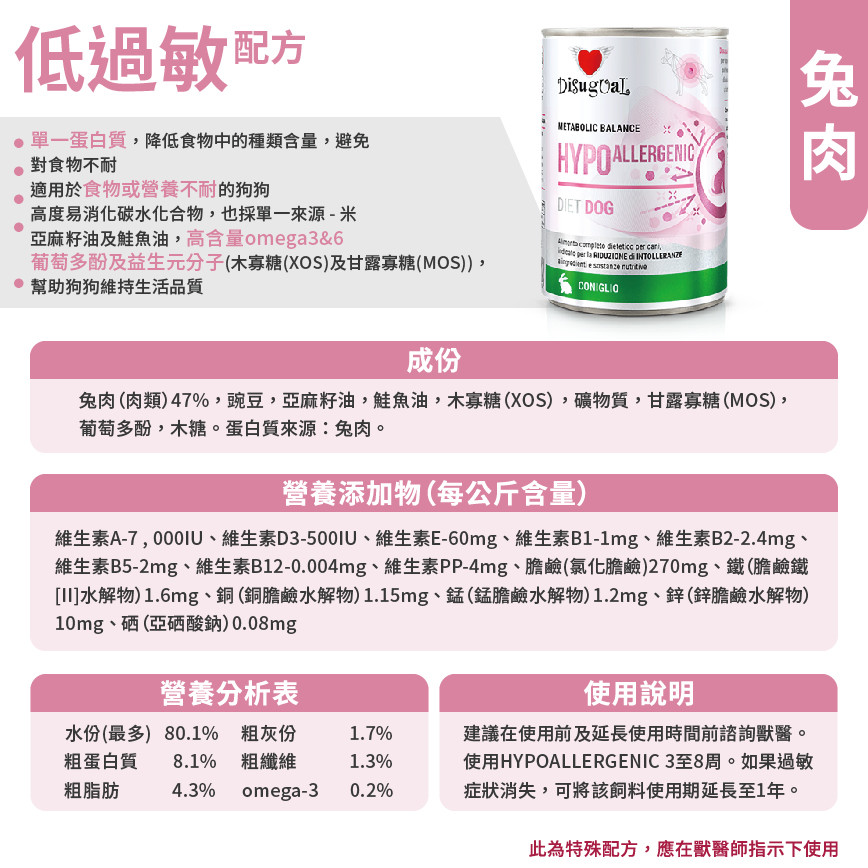 首頁 > 狗狗 > 狗罐頭 狗濕糧 > Disugual 處方糧 > Disugual 意極鮮 處方糧 狗罐頭 低敏配方 兔肉 400g (DSDT002) | 意大利製造