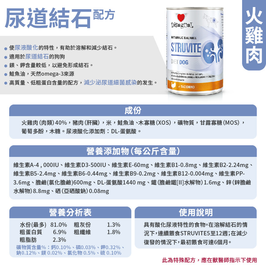 Disugual 意極鮮 處方糧 狗罐頭 防尿石配方 火雞 400g (DSDT061) | 意大利製造