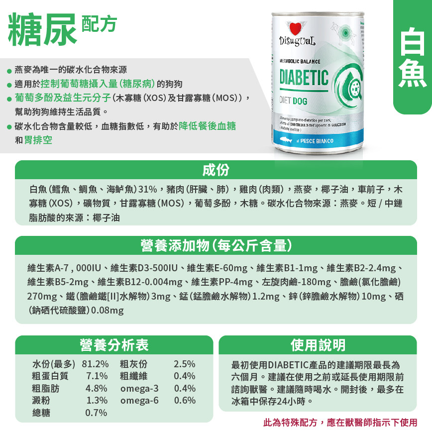 正貨保證!Disugual 意極鮮 處方糧狗罐頭,專為糖尿病狗狗設計,含白魚成分,400g裝意大利製造。為愛犬提供專業營養,有效管理血糖。立即選購,限時免費送貨! Disugual 意極鮮 處方糧 狗罐頭 糖尿病配方 白魚 400g (DSDT082) | 意大利製造