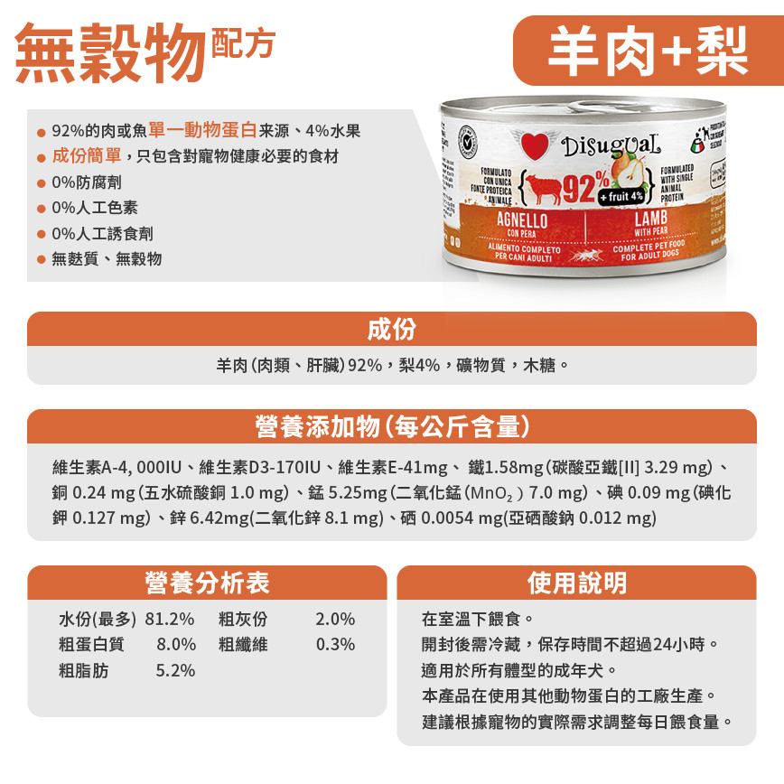 Disugual 意極鮮 狗罐頭 狗主食罐 92%鮮肉 無穀物羊肉及梨 150g (FRUT101) | 意大利製造