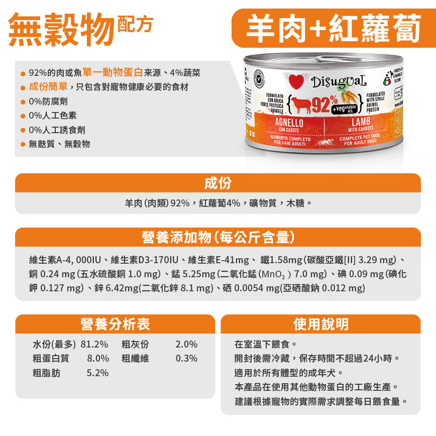 優質營養!Disugual 意極鮮 狗罐頭,含92%鮮肉,無穀物羊肉及紅蘿蔔配方,150g,意大利製造,專為成犬設計。提供均衡營養,助愛犬健康成長。立即選購,享至抵價格保證! Disugual 意極鮮 狗罐頭 狗主食罐 92%鮮肉 無穀物羊肉及紅蘿蔔 150g (DSBL101) | 意大利製造