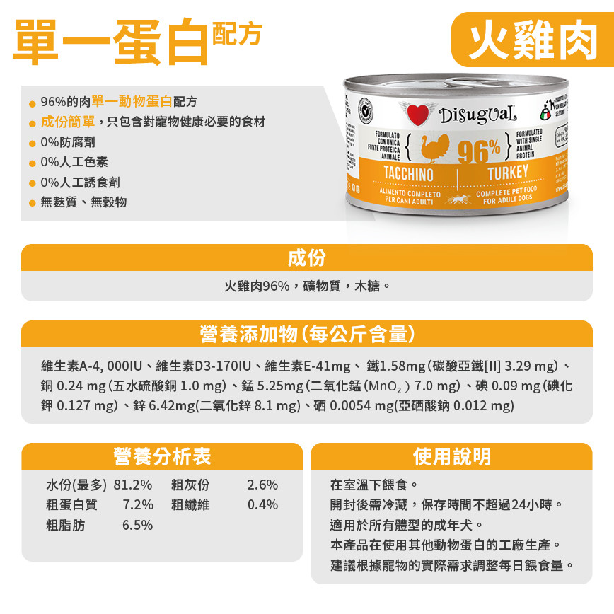 Disugual 意極鮮 狗罐頭 狗主食罐 96%極品鮮肉 單一蛋白配方 火雞 150g (DSGV112) | 意大利製造