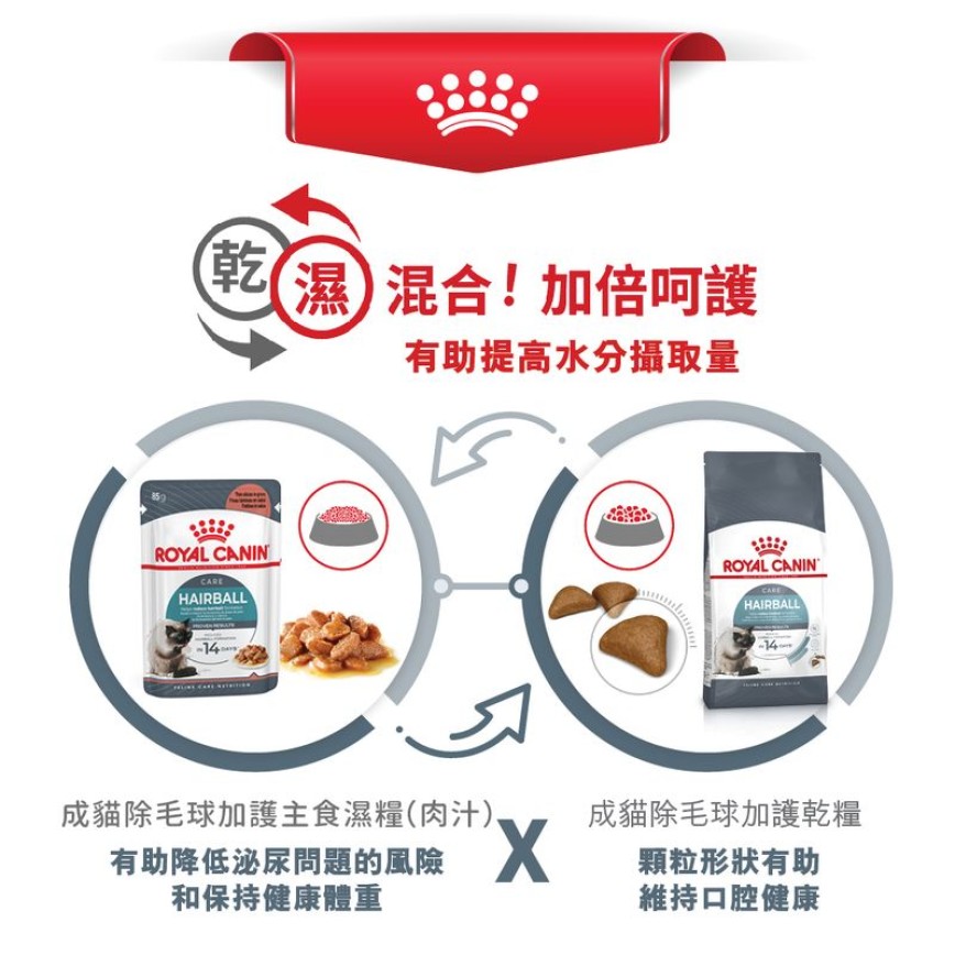 Royal Canin 特別針對這一問題,研發了去毛球成貓糧,有效刺激腸道轉運,